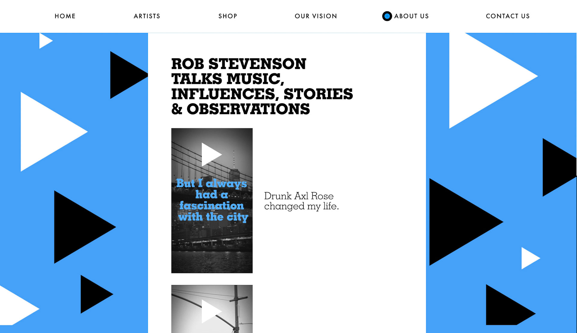 An information giving format evoking the founder's long, successful history in the music industry - as well as their relationships with talented artists and music that connects.
